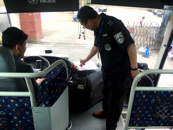 車輛出口門檢崗位上,保衛(wèi)稽查科員認真核對人數(shù)、提醒乘客系好安全帶,把好“五不出站”關(guān)口。