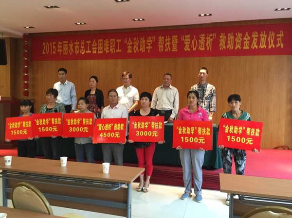 “金秋助學(xué)”幫扶暨“愛心透析”救助是麗水市總工會(huì)為切實(shí)解決困難職工子女上學(xué)難問(wèn)題,幫助寒門學(xué)子圓夢(mèng)的一項(xiàng)公益活動(dòng),每年發(fā)放一次。在今年市總工會(huì)的活動(dòng)通知下發(fā)后,單位工會(huì)領(lǐng)導(dǎo)十分重視,組織在集團(tuán)公司內(nèi)進(jìn)行了一次摸底調(diào)查工作,以確保解決單位困難職工家庭子女上學(xué)難問(wèn)題。經(jīng)過(guò)調(diào)查摸底,材料申報(bào),市總工會(huì)審批,我單位5名困難職工得到3000元和1500元不等的救助。