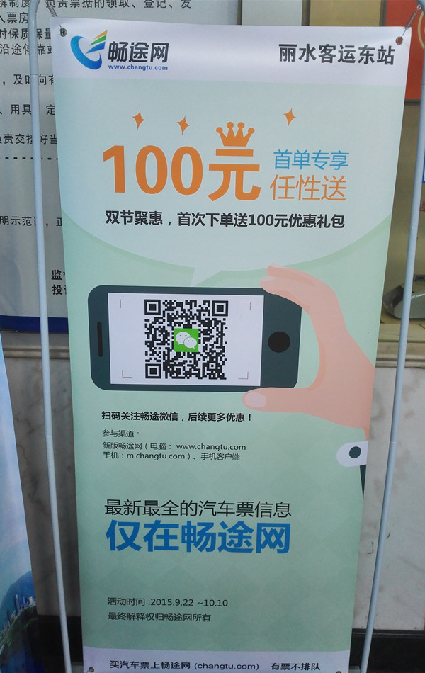 中秋、國慶即將來臨,為了方便旅客購票,從9月22日至10月10日,客運東、西兩站和暢途網(wǎng)開展了“慶中秋、迎國慶”網(wǎng)絡(luò)購票送優(yōu)惠活動,首次下單送100元優(yōu)惠禮包(100元=50*1+20*1+10*2+5*2;每張優(yōu)惠券有效期90天,共計6張券)。詳見兩戰(zhàn)售票廳海報。